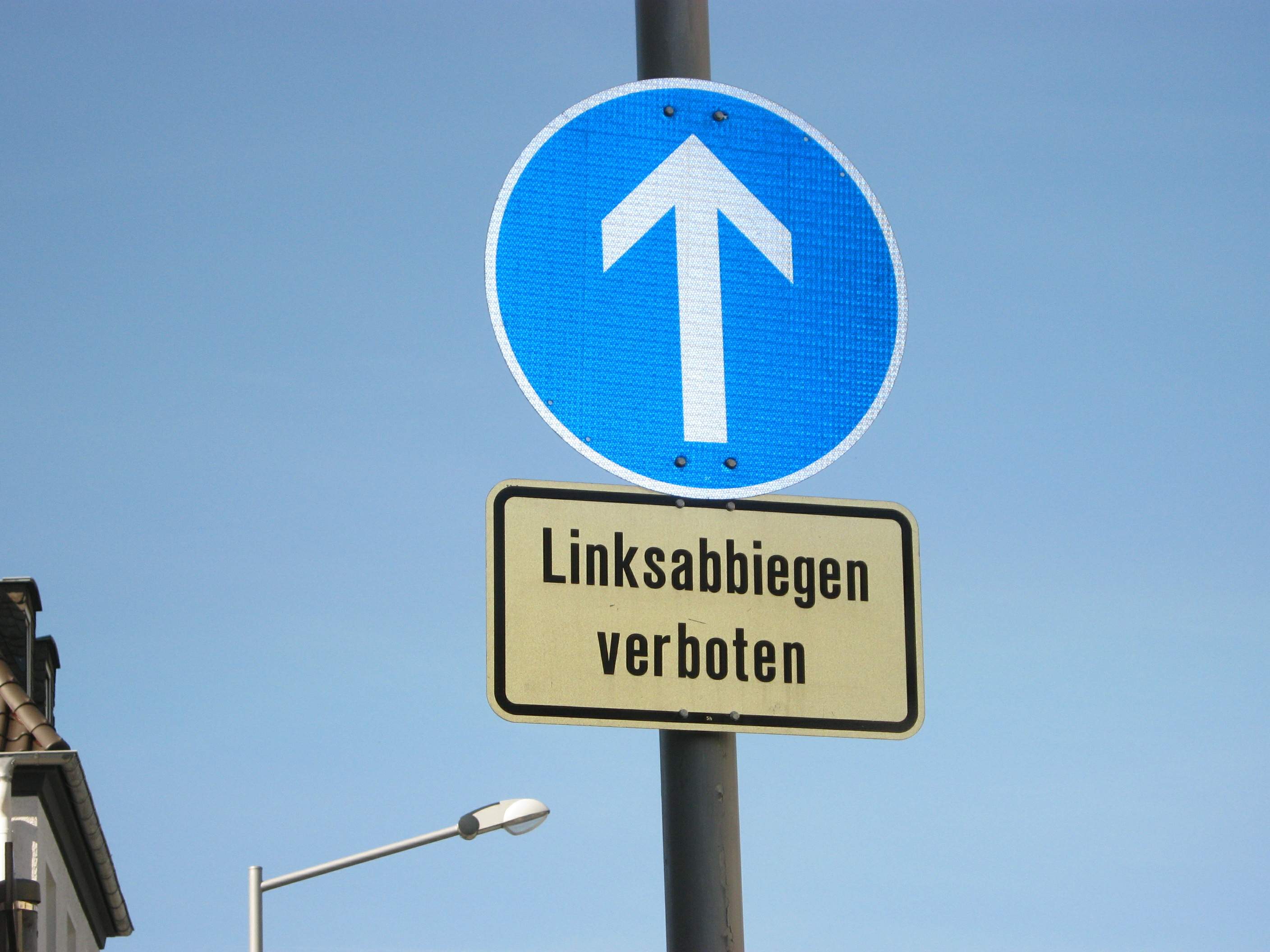 "Doppelt genäht, hält besser": Zeichen 209-30 mit Zusatzschild "Linksabbiegen verboten"